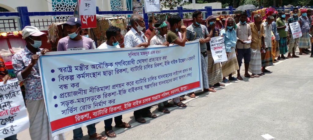 ২৩ জুনÕ২১ বুধবার সকাল ১১টায় রিক্সা, ব্যাটারী চালিত রিক্সা, ইজি বাইক সংগ্রাম পরিষদ রংপুরের উদ্যোগে নগরের শাপলা চত্ত্বর থেকে রিক্সা ও অটো চালকরা রিক্সাযোগে নগরের প্রধান সড়ক প্রদক্ষিণ শেষে স্থানীয় কাচারী বাজারে অটো সংগঠনের নেতা মাইদুল ইসলাম মিলনের সভাপতিত্বে বক্তব্য রাখেন সংগ্রাম পরিষদের সদস্য গোলাম রব্বানী, পারভেজ, বিপ্লব, সবুজ মিয়া, মনোয়ার হোসেন প্রমুখ। এছাড়া বাসদ রংপুর জেলা আহবায়ক ও সংগ্রাম পরিষদের উপদেষ্টা কমরেড আব্দুল কুদ্দুস, সদস্য সচিব, মমিনুল ইসলাম, সভা পরিচালনা করেন সমাজতান্ত্রিক শ্রমিক ফ্রন্টের নগর সাধারণ সম্পাদক মিজানুর রহমান। বক্তারা গত ২০ জুলাই স্বরাষ্ট্রমন্ত্রী ব্যাটারি চালিত রিক্সা, ভ্যান, ইজি বাইক বন্ধের গণবিরোধী অযৌক্তিক সিদ্ধান্তের তীব্র নিন্দা ও ক্ষোভ প্রকাশ করেন। বক্তারা আরোও বলেন সারা বিশ্বে করোনা মহামারীতে জীবন-জীবিকা, দেশের প্রথম দশটি দরিদ্র জেলার মধ্যে রংপুর বিভাগের ৮টি জেলা, এখানে কোনো ভারী শিল্প প্রতিষ্ঠান না থাকায় ব্যাটারি চালিত রিকশা একটি প্রধানতম উপার্জনের মাধ্যম। এ পেশা বন্ধ হলে লক্ষ লক্ষ ব্যাটারি চালিত রিকশা ও অটো বাইক চালক বেকার হয়ে যাবে। বাংলাদেশের প্রায় ৮ কোটি মানুষ স্বাস্থ্য ও খাদ্য নিরাপত্তা হীনতায় ভুগছে এর মধ্যে কারও কর্মজীবন ও অপ্রাতিষ্ঠানিক ৫ কোটি ১৭ লাখ শ্রমিক রয়েছে এদেশের জনগণের খাদ্য নিরাপত্তা নিয়ে রিক্সা-ভ্যান শ্রমিকদের কর্মহীন করার সিদ্ধান্ত সরকারের স্বৈরাচারী আচরণের বহিঃপ্রকাশ। রিক্সা ব্যাটারি রিক্সা সংগ্রাম পরিষদ বিকল্প কর্মসংস্থান ছাড়া রিক্সা ব্যাটারি রিকশা উচ্ছেদ হয়রানি বন্ধ করে প্রয়োজনে নীতিমালা প্রণয়ন করা, ব্যাটারি চালিত যানবাহন লাইসেন্স প্রদানের বিশেষজ্ঞ নিয়োগ এবং নিরাপত্তা নিশ্চিত করতে সড়ক-মহাসড়কে রিক্সা ইজি বাইক চলাচলের আলাদা লেন সার্ভিস নির্মাণসহ পুলিশি হয়রানি-নির্যাতন বন্ধ ও সর্বত্র তোলাবাজি, চাঁদাবাজি বন্ধের দাবি করেন। নেতৃবৃন্দ আরো বলেন, এর সাথে জড়িত তাদের পরিবারের আড়াই কোটি মানুষের জীবন-জীবীকা প্রত্যক্ষ ও পরোভাবে যুক্ত দেশের অর্থনীতিতে গুরুত্বপূর্ণ ভূমিকা রাখছে, তাই বক্তারা বিশেষজ্ঞের আলোচনা ও মতামতের ভিত্তিতে ব্যাটারি রিক্সা ও ভ্যান চলাচলের দাবি জানান। এছাড়া আগামী ১০ জুলাই কেন্দ্রীয় সংগ্রাম পরিষদের ঘোষণামতে রংপুরে জেলা প্রশাসকের মাধ্যমে স্বরাষ্ট্রমন্ত্রী বরাবর স্মারকলিপি পেশের কর্মসূচি ঘোষণা করেন। তার আগে জেলা-উপজেলায় গণসংযোগ, মিছিল-সমাবেশ, প্রচারপত্র বিলি কর্মসূচি ঘোষণা করেন।