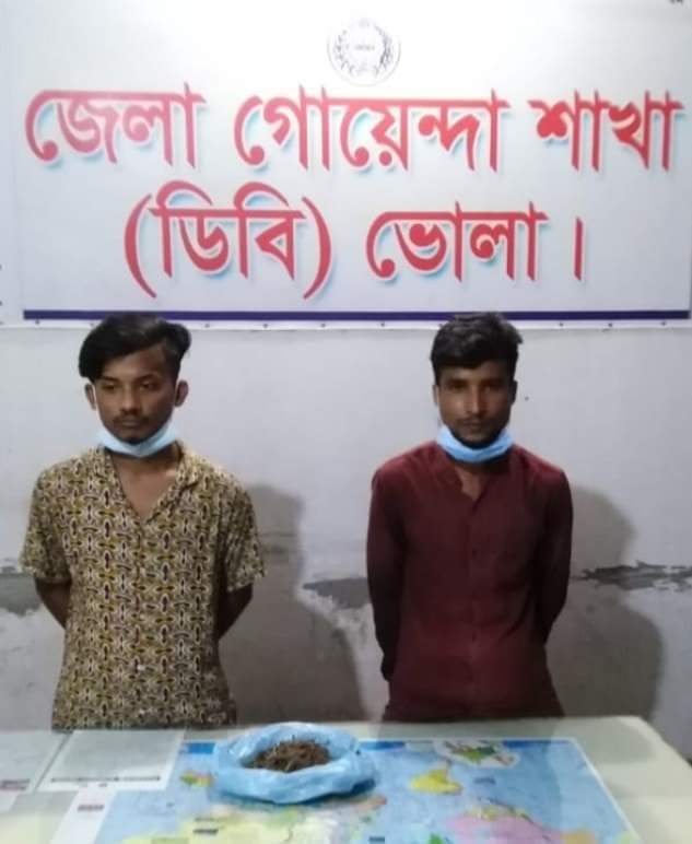 গোপন সংবাদের ভিত্তিতে ডিবি ওসি শহিদুল ইসলামের নেতৃত্বে গতকাল শনিবার ০৪:৪৫ ঘটিকায় এস আই মোঃআবুল হোসেন এর দিকনির্দেশনায় বোরহানউদ্দিনের বড় মানিকা ইউনিয়ন ২ নং ওয়ার্ড হইতে মাদক ব্যবসায়ী ১ মোঃ আব্বাস বেপারী (৩২) ২ রনী হাওলাদার (১৯)কে অবৈধ মাদকদ্রব্য ১০০ (একশত) গ্রাম গাঁজা সহ গ্রেফতার করেন ডিবি পুলিশ।