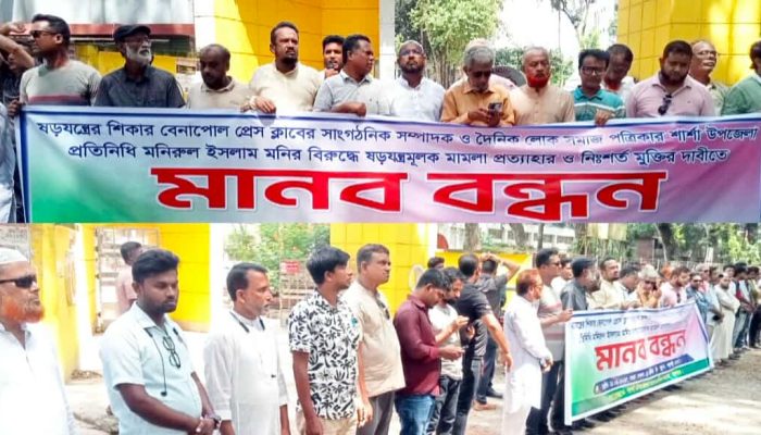 বিল্লাল হুসাইন;যশোর: যশোরের শার্শায় ষড়যন্ত্রমূলক মিথ্যা মামলায় আটক হওয়া দৈনিক দিনকাল ও দৈনিক লোকসমাজ পত্রিকার শার্শা উপজেলা প্রতিনিধি মনিরুল ইসলাম মনি’র নিঃশর্ত মুক্তি এবং মামলা প্রত্যাহারের দাবিতে মানববন্ধন অনুষ্ঠিত হয়েছে। বিস্তারিত